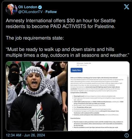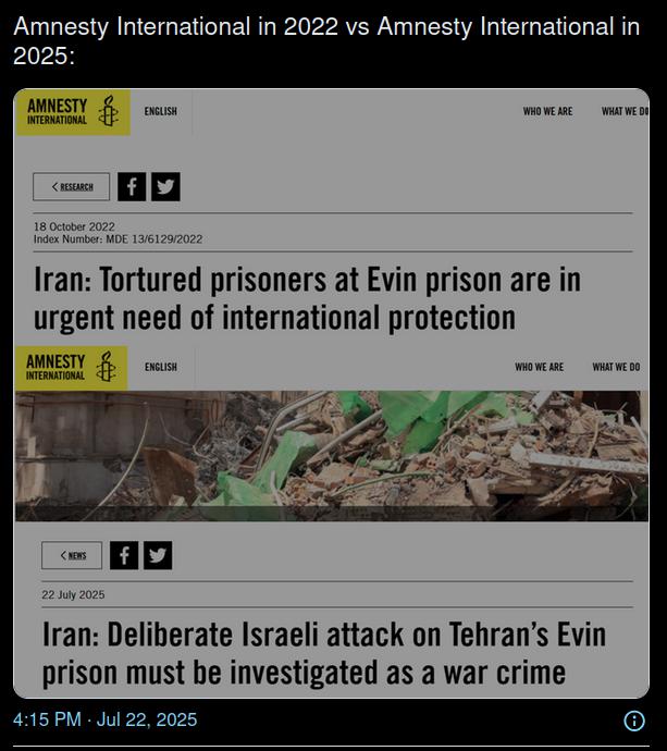 TOMMY ROBINSON? Har Amnisty International nogensinde fordømt terrororganisation Hamas? Har man ( AI) undersøgt nogetsomhelst vedrørende 7 oktober terrormassakren? Har man fordømt at civile steder som hospitaler og børnehaver bruges til afsæt af rakketer. Har AI nogensinde fordømt hamas stjæler nødhjælp så civilbefolkningen kan bruges som propaganda imod Israel, imens nødhjælpen financiere hamaskrigen imod mellemøsten eneste frie demokratiske stat?
