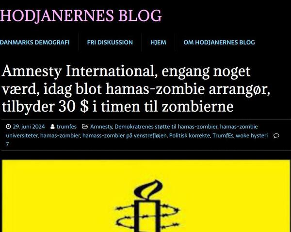 At Enhedslisten etisk og moralsk er blevet perverteret i H og R, undre mig ikke ( mænd kan føde børn. Pernille Skipper i Folketinget), men at AI har degraderet sin integritet til hamaszombie niveau og til nul og nix, finder jeg trist. Boycot Amnisty International. To minuters stilhed for ofrene på Novafestivallen i Roskilde? Så meget for dens solidaritet med en fri demokratisk verden. Boykot dem der ikke støtter israel I den tid. Hjertelig tak til Trump og usa for indsatsen imod Iran.