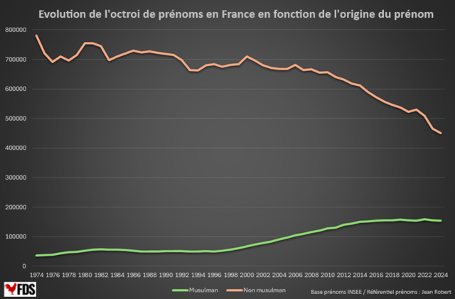 En analyse af den årlige navnestatistik fra det franske nationale statistikbureau INSEE foretaget af den højrepopulistiske nyhedsportal Fdesouche viser, at lidt over hver fjerde nyfødte baby i Frankrig havde et arabisk eller muslimsk navn i 2024.