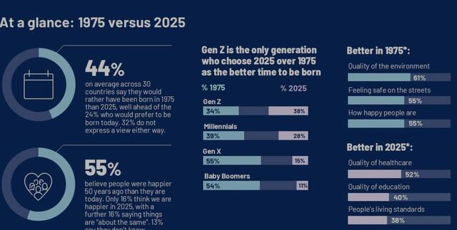 “Some 63 per cent in the UK said they agreed with the statement “All things considered, how would you describe things in your country today, compared with 50 years ago, in 1975?”, five times more than the 12 per cent who say people are happier in 2025.”