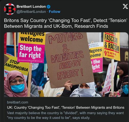 Much discontent appears to revolve around the migration issue. Another poll found most Britons agreed that “We risk losing our national identity if we are too open to people from all over the world”, that “It is bad for society if white people decline as a share of the population”, and that “society is weakened by being made up of many different races, ethnicities, and religions”.