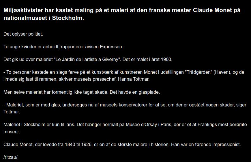 Heldigvis var Monet maleriet bag en glasplade og derfor sandlynligvis ikke ødelagt at de to vandaler