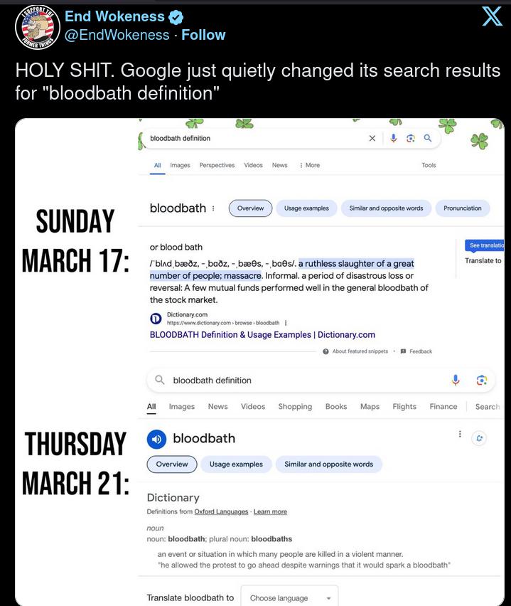 Censur-svinene på Google ændrer lige definitionen på Bloodbath, så det passer på fake-news-msm’s seneste løgne om Trump… 21. marts 2024 trumfes Censur Youtube(=Google), censur-Google, Fake News MSM, Fup og snyd, google youtube facebook twitter censur, Politisk korrekte, Totalitære, TrumfEs 0 Sikke dog en “overraskelse” … Taget herfra TweetPinShare0 Shares Google redefinerer bloodbath for at passe til msm