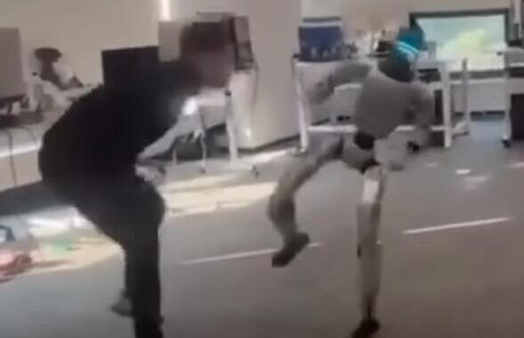 Her efterligner en robot efterligner et spark og rammer mand – det er problemet med at robotter lærer via AI ved at se hvad et menenske gør og så efterligner det 🙁