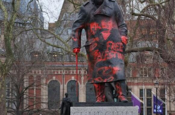 Beskederne »Free Palestine!«, »Zionist war criminal« og »Globalise the intifada!« blev malet på statuen af den tidligere premierminister i Westminster i nat, ifølge The Telegraph.