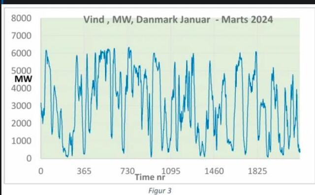Figur 3 herunder viser vindkraftydelsen time for time i første kvartal 2024. Det ses, at denne varierer voldsomt og hurtigt, og den vil under ingen omstændigheder kunne levere en strømforsyning til dækning af behovet uden samtidig back-up fra andre kilder. Denne og tilsvarende forløbskurver findes ikke i publikationer fra Energistyrelsen og vindindustrien.