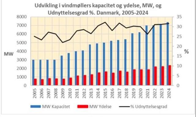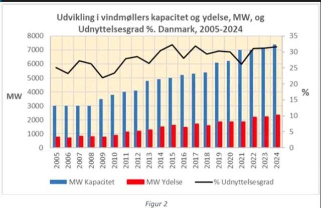 Det skriver Ib Andersen og Soren Kjaersgaard om her i en meget informativ artikel, der viser at danske vindmøllers produktion kun udnytter en delmængde af vindmøllekapaciteten !