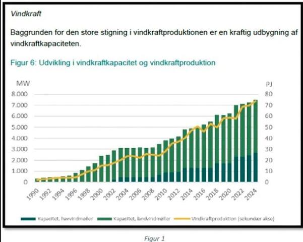 Figuren er korrekt. Stavene viser udviklingen i installeret kapacitet i MW. Og den gule kurve viser den årlige ydelse i PJ. Den hastige og ukritiske læser vil konkludere: ”Det ser jo fint ud, den gule kurve følges med stavkurverne.” og vil som oftest ikke hæfte sig ved, at stavene referer til skalaen til venstre, MW, medens kurven refererer til skalaen til højre (PJ/år). Havde man, som god faglig praksis kræver, anvendt den samme enhed for kapacitet og ydelse ville man straks kunne se, at kapaciteten kun udnyttes med ca. 30%. Der er ingen forklaring om, at vinden varierer voldsomt og ukontrollabelt. Vind er derfor kun anvendelig i elforsyninger, så vidt der er tilstrækkelig back-up fra andre kilder til at erstatte manglende vind.