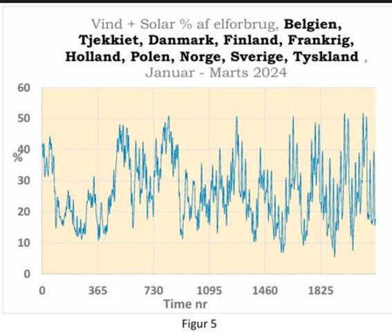 Vinds + sols sammenlagte andel af elforsyningen, time for time i første kvartal 2024, i Belgien, Tjekkiet, Danmark, Finland, Frankrig, Holland, Polen, Norge, Sverige og Tyskland varierer ukontrollabelt og hyppigt mellem 5% og 50%.