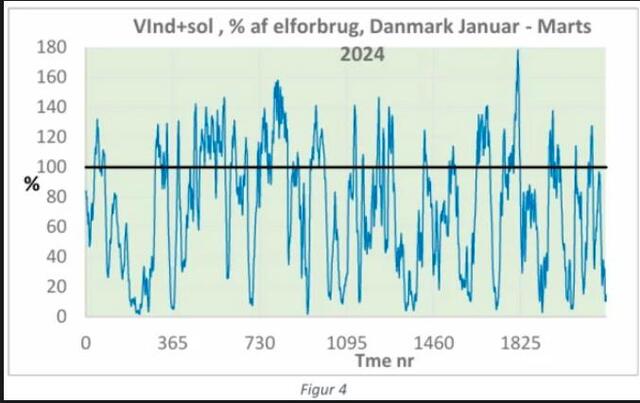 Dette samme gælder i figur 4 herunder, der viser vind+sols meget varierende andel i % af elforbruget. Det er en besværlig og dyr indsats døgnet rundt at skulle sikre de danske forbrugere 220 V 24/7 ved køb af el fra træflisanlæg eller fra el-markedet pga manglende vind og sol.