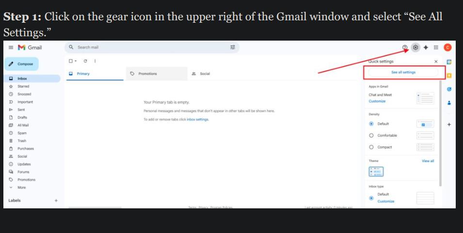 Step 1: Click on the gear icon in the upper right of the Gmail window and select “See All Settings.”