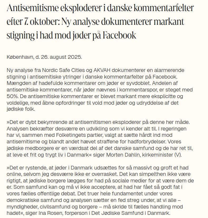 Jeg så forleden den digitale chef for TV2-news, der påstod at være overrasket/rystet over en ny undersøgelse , der viste stærkt stigende antisemitisme i Danmark på facebook