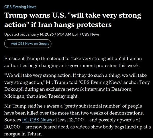 Jeg har stor tillid til Trump, men jeg synes han er for langsom til at effektualisere hans egen trussel til Iran om at USA vil reagere voldsomt mod mullaherne , hvis ikke de stander blodbadet på ubevæbnede demonstranter