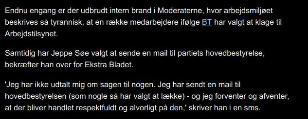 “Konkret beskriver mediet, hvordan fem nuværende medarbejdere samt en række tidligere har klaget til Arbejdstilsynet over ledelsesstilen i partiet. Blandt andre klages der over den nyudnævnte minister Caroline Stage, partisekretær Kirsten Munch og kommunikationschef Ulla Østergaaard. Dertil beskriver BT, at der også er anmeldt problemer med en ledende medarbejder, som mediet har anonymiseret.”