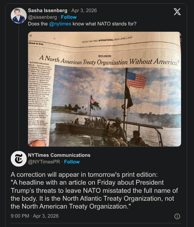The Times apparently forgot that detail, and, after being mocked on social media, quietly issued a correction through its communications team on X.