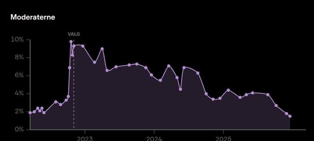 I målingen siger blot 1,5 procent af vælgerne, at de vil sætte deres kryds ved Lars Løkke Rasmussens parti. Moderaterne er dermed for anden måling i træk under spærregrænsen, og det er samtidig det laveste niveau, som Epinion har målt Moderaterne til, siden partiet blev opstillingsberettiget i 2022.
