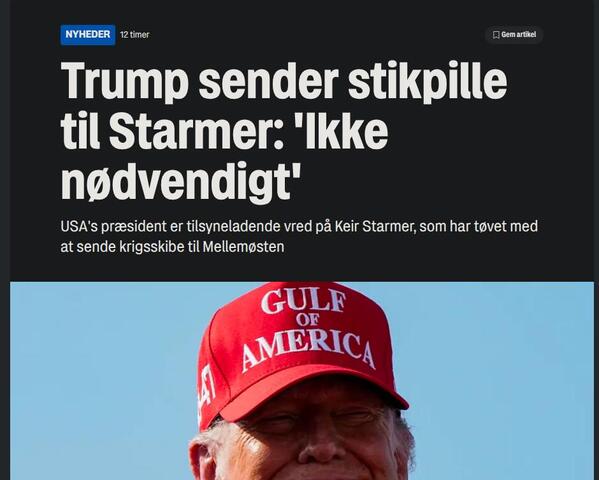 “USA’s præsident er tilsyneladende vred på Keir Starmer, som har tøvet med at sende krigsskibe til Mellemøsten” fra EB idag …