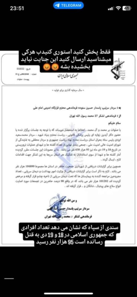 Dokumentet hævder ekstremt høje dødstal under protesterne den 18.-19. januar “di” (persisk kalender, svarende til 8.-9. januar i den gregorianske kalender).