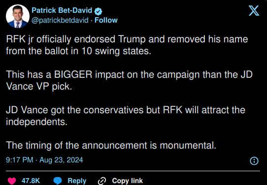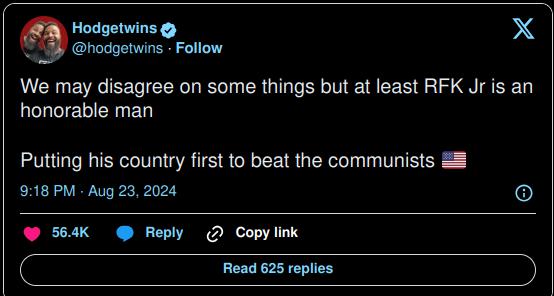 Den uafhængige kandidat RFK jr standser sin kampagne og trækker sig fra 10 af de 19 stater, han er opstillet i for at gavne Trump og generee at det Udemokratiske parti ! De 10 er swingstaterne 🙂