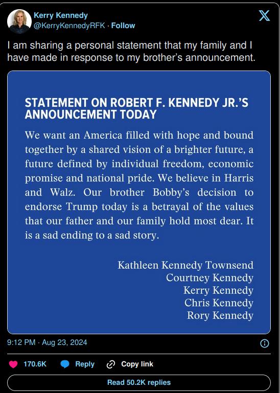 Næsten samtlige danske røde Fake News medier omtaler kun, at Kennedy’s øvrige familie tager afstand fra hans støtte til Trump.