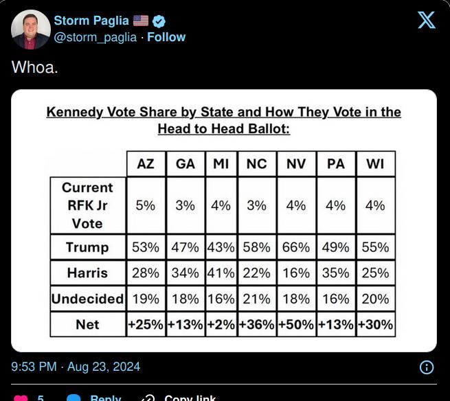 Hvis alle 5% fra RFK Jr går til Trump, vil han føre med NET = 25% + 5% = +30%