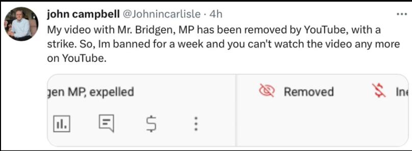 Der står godt nok at det var uploaderen, altså Campbell, der har fjernet den. Men “mærkeligvis” har Campbell IKKE fjernet videoen fra andre vidoekanaler, der ikke censurerer … Så mon ikke censurSVINENE på youtube har givet ham valget : fjern selv den afslørende video eller youtube fjerner alle dine videoer …