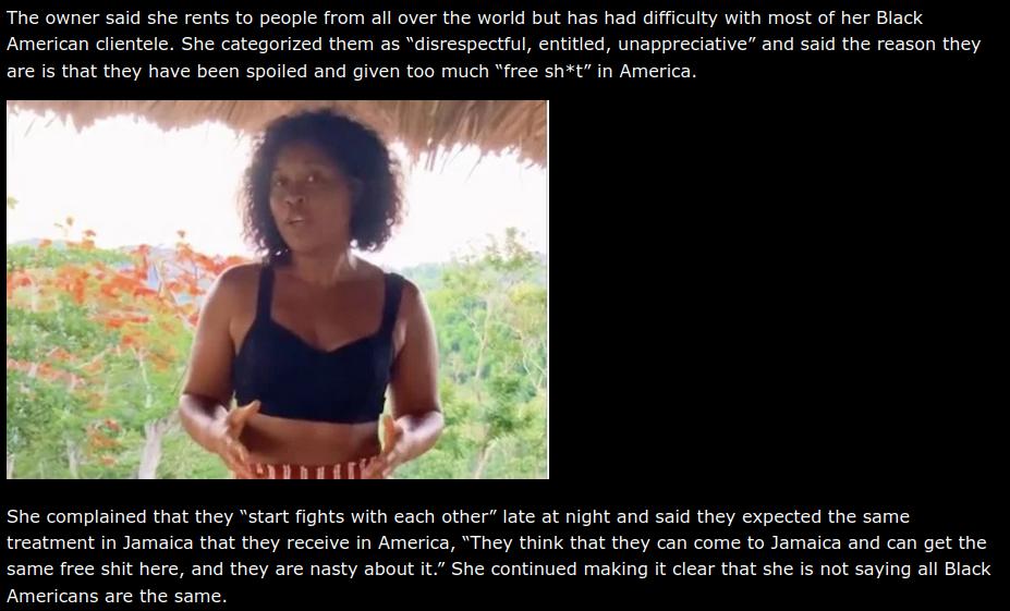Controversy has erupted around a video by the owner of Rustic Mountain Living, a Jamaican cottage rental business. The woman says she will no longer allow short-term rentals for black Americans. pic.twitter.com/YqKbATMiAZ
