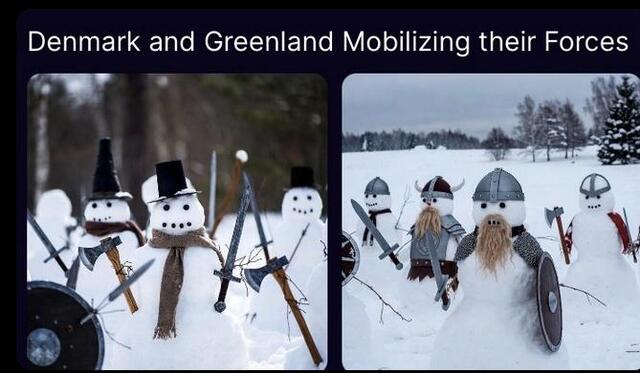 Hørt på lokalradios nyheder ( alfa gold). Noget med at statsministeren ikke ville svare på om Danmark ville gribe millitær til, hvis USA angreb Grønland ( klogt ikke at ville svare på det. Musen tager boksehandsker på overfor elefanten). Det var selvfølgelig på de radikales møde i Ålborg. ( dobbelt tjek det), og så også noget med at den tidligere svenske statsminister syntes Sverige skulle sende soldater til Grønland. Se dog at få en aftale i hus med USA. 34000 mennesker ( grøndlændere) på et område der er større end Frankrig, benelux og Tyskland tilsammen. Hvis ikke større. Hvordan vil man kontrollere det uden USA?