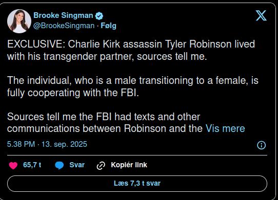 “Charlie Kirks formodede morder, Tyler Robinson, boede sammen med en transkønnet partner. Robinsons bofælle var i færd med at skifte fra mand til kvinde, bekræftede en politikilde over for New York Post i lørdags.”